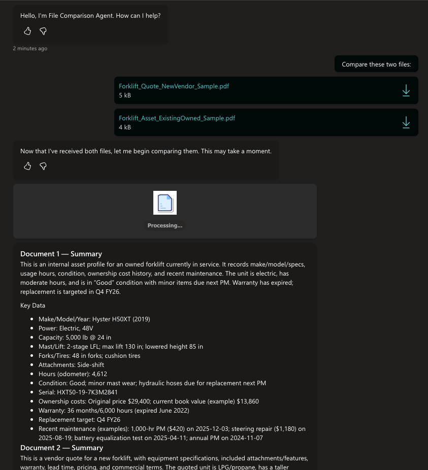 In my demo, I compared two forklift related PDFs (a vendor quote vs an existing asset profile). That is a great real-world example because the differences show up across specs, warranty, pricing, delivery, and included features.